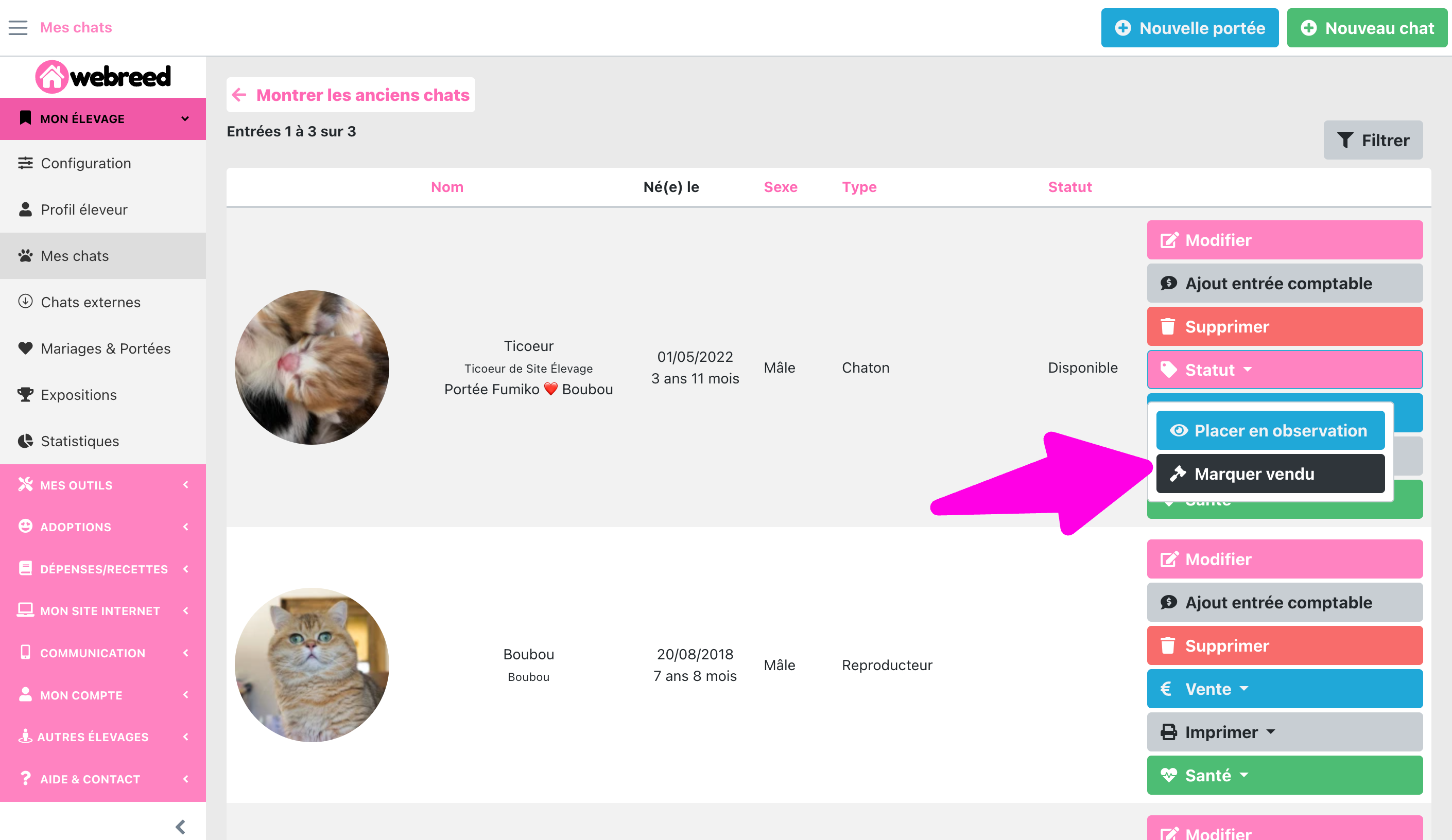 Allez dans le menu Mon élevage > Mes chats / Mes chiens. Dans la liste, cliquez sur le bouton Statut puis "Marquer comme vendu". Il faudra ensuite aller manuellement sortir l'animal de votre registre entrées / sorties. Pour cela allez dans le menu Mes outils > Entrée/Sortie, puis allez dans la fiche de votre animal et renseignez la sortie.